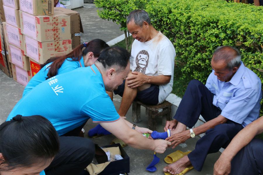 捐贈現場(chǎng),大(dà)家(jiā)都自發的蹲下,給老人家(jiā)穿上(shàng)新襪子,換上(shàng)新鞋子,還(hái)給大(dà)家(jiā)帶去了歌(gē)舞表演。一位老人家(jiā)動容地說: